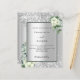 Faux silver looking background decorated with white florals, flowers, eucalyptus greenery and faux silver glitter, sparkles. Personalise and add your names and wedding details. Black letters.