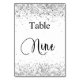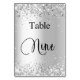 The table number is written with an elegant hand lettered style script. Black letters, a white background on front and faux silver background with faux glitter dust, sparkles on the back.