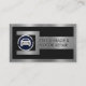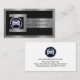 Cover features a faux silver wrench border frame design. The wrench holds on to a silver car logo (akin to a silver nut) you can use. To the right of this, on the handle, is the business name which you can change.