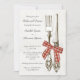 Invite your guests to a comfortable and casual rehearsal dinner with this rehearsal dinner invitation featuring silverware and a red chequered table cloth background.