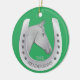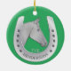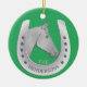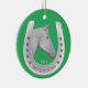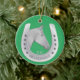 An ornament with a classic horse and horseshoe emblem with a dimensional look personalised with your family name or you can use a first name or your horse's name instead. An equine accent for your holiday celebrations. Makes a great gift for horse lovers, horse owners and horse racing fans. Silvery grey colours echo the colour of horse shoes. Classic, Elegant. Beautiful and Fun Equestrian Style.