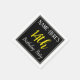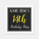 This simple and elegant paper napkin design features a message like "Name-Here’s 14th Birthday Party", with the "14th" in fancy yellow-coloured text, within a black-coloured square area featuring a simple border outline. The name can be customised. Napkins like these could perhaps be used at a birthday party for somebody who is celebrating their fourteenth birthday. [~Z0000150]