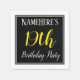 This simple and elegant paper napkin design features a message like "NameHere’s 19th Birthday Party", with the "19th" in fancy yellow-coloured text, within a black-coloured square area featuring a simple border outline. The name can be customised. Napkins like these could perhaps be used at a birthday party for somebody who is celebrating their nineteenth birthday. [~Z0000150]