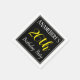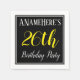 This simple and elegant paper napkin design features a message like "ANameHere’s 26th Birthday Party", with the "26th" in fancy yellow-coloured text, within a black-coloured square area featuring a simple border outline. The name can be customised. Napkins like these could perhaps be used at a birthday party for somebody who is celebrating their twenty sixth birthday. [~Z0000150]