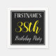 This simple and elegant paper napkin design features a message like "FirstName’s 38th Birthday Party", with the "38th" in fancy yellow-coloured text, within a black-coloured square area featuring a simple border outline. A custom name can be used. Napkins like these could perhaps be used at a birthday party for somebody who is celebrating their thirty eighth birthday. [~Z0000150]