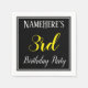 This simple and elegant paper napkin design features a message like "NameHere’s 3rd Birthday Party", with the "3rd" in fancy yellow-coloured text, within a black-coloured square area featuring a simple border outline. A personalised name can be used. Napkins like these could perhaps be used at a birthday party for somebody who is celebrating their third birthday. [~Z0000150]