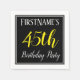 This simple and elegant paper napkin design features a message like "FirstName’s 45th Birthday Party", with the "45th" in fancy yellow-coloured text, within a black-coloured square area featuring a simple border outline. A custom name can be used. Napkins like these could perhaps be used at a birthday party for somebody who is celebrating their forty fifth birthday. [~Z0000150]