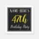 This simple and elegant paper napkin design features a message like "Name-Here’s 47th Birthday Party", with the "47th" in fancy yellow-coloured text, within a black-coloured square area featuring a simple border outline. A custom name can be used. Napkins like these could perhaps be used at a birthday party for somebody who is celebrating their forty seventh birthday. [~Z0000150]