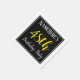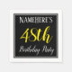 This simple and elegant paper napkin design features a message like "NameHere’s 48th Birthday Party", with the "48th" in fancy yellow-coloured text, within a black-coloured square area featuring a simple border outline. A personalised name can be used. Napkins like these could perhaps be used at a birthday party for somebody who is celebrating their forty eighth birthday. [~Z0000150]