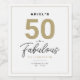 Simple black, white and gold "50 and Fabulous" birthday party sign with classy and elegant typography. Customise it easily with age, name, party date and venue. Perfect for birthday gift or party favour.