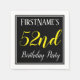 This simple and elegant paper napkin design features a message like "FirstName’s 52nd Birthday Party", with the "52nd" in fancy yellow-coloured text, within a black-coloured square area featuring a simple border outline. A personalised name can be used. Napkins like these could perhaps be used at a birthday party for somebody who is celebrating their fifty second birthday. [~Z0000150]