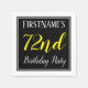 This simple and elegant paper napkin design features a message like "FirstName’s 72nd Birthday Party", with the "72nd" in fancy yellow-coloured text, within a black-coloured square area featuring a simple border outline. A personalised name can be used. Napkins like these could perhaps be used at a birthday party for somebody who is celebrating their seventy second birthday. [~Z0000150]
