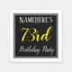 This simple and elegant paper napkin design features a message like "NameHere’s 73rd Birthday Party", with the "73rd" in fancy yellow-coloured text, within a black-coloured square area featuring a simple border outline. A personalised name can be used. Napkins like these could perhaps be used at a birthday party for somebody who is celebrating their seventy third birthday. [~Z0000150]