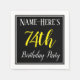 This simple and elegant paper napkin design features a message like "Name-Here’s 74th Birthday Party", with the "74th" in fancy yellow-coloured text, within a black-coloured square area featuring a simple border outline. The name can be personalised. Napkins like these could perhaps be used at a birthday party for somebody who is celebrating their seventy fourth birthday. [~Z0000150]