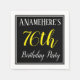 This simple and elegant paper napkin design features a message like "ANameHere’s 76th Birthday Party", with the "76th" in fancy yellow-coloured text, within a black-coloured square area featuring a simple border outline. A personalised name can be used. Napkins like these could perhaps be used at a birthday party for somebody who is celebrating their seventy sixth birthday. [~Z0000150]