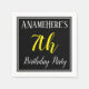 This simple and elegant paper napkin design features a message like "ANameHere’s 7th Birthday Party", with the "7th" in fancy yellow-coloured text, within a black-coloured square area featuring a simple border outline. The name can be customised. Napkins like these could perhaps be used at a birthday party for somebody who is celebrating their seventh birthday. [~Z0000150]