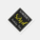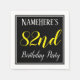 This simple and elegant paper napkin design features a message like "NameHere’s 82nd Birthday Party", with the "82nd" in fancy yellow-coloured text, within a black-coloured square area featuring a simple border outline. The name can be customised. Napkins like these could perhaps be used at a birthday party for somebody who is celebrating their eighty second birthday. [~Z0000150]