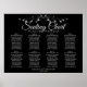 This 8 table seating chart will make it easy for your guests to find their seats at your wedding reception. Features a simple elegant design of pale silver grey text with a black background and a silver vintage floral filigree border. Has seating assignments for 80 guests.