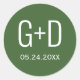 Simple and elegant initials moss green wedding Classic Round Sticker. It displays your initial and the date of your wedding in white on green. It coordinates with our "Colourful leaf print" products for a fall or autumn wedding.