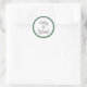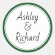 Simple and elegant names dark green and white wedding Classic Round Sticker. It displays your names on white with a green border. It coordinates with our "Green tropical leaves" wedding collection.