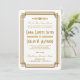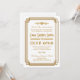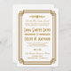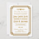These wedding invitations feature a white and gold colour palette, a geometric frame, and other stylistic details all inspired by Art Deco and the roaring twenties. You can customise the sample text fields to your liking.