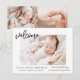 Simple Baby Announcement Elegant Photo Collage that have a photo on the front and 4 Picture on the back. The cards contain a modern hand lettered cursive script typography that are elegant, simple and modern to use for a newborn baby boy or baby girl sent out by the mother and father of the infant child to family and friends.
