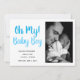 simple and modern script baby boy birth announcement template card featuring four pictures of your baby boy photos (front and back)! Customise this product by adding your child's birth stat at the bottom!