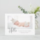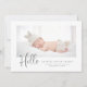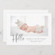 A simple and stylish photo birth template announcement 2-sided card features a photo of your newborn baby boy or girl, custom message that can be personalised, hand lettered typography text that says "Hello" with a script thank you and heart in between — above your message on back. You can customise baby's name and stats on front and thank you message on the back of the card. A place for a second picture on the back. ©Marisu Valencia