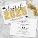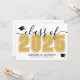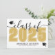 This classic yet modern horizontal graduation announcement doubles as a party invitation. The front features an oversized "Class of 2025" in bold black and white, with the year in a rich yellow gold, complemented by elegant grey script accents. Two graduation cap icons add a celebratory touch, with space below for the graduate's name and school. Colours can be customised to match school colours for a personalised look.
