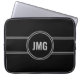 You can personalise the silver monogram that's in the centre of this black laptop sleeve. The text is inside of a black circle that has a double border. The circle's borders are silver. Four silver lines go across the sleeve.