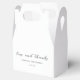 Modern wedding favour boxes featuring a simple design with classic serif and elegant script fonts. The design includes "love and thanks" and your names and wedding date.