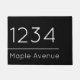 This black doormat has white text you can edit to show your street address. Digits for your house number are above a horizontal line and text for your street name.