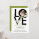 This modern Valentine's Day party invitation features a bold, black script spelling "Love," beautifully decorated with a delicate garland of white flowers and green leaves. Inside one of the letters, there’s a couple’s photo, adding a personal touch to the design. The back of the invitation is a vibrant, bright green, enhancing its festive appeal. This elegant invitation can be customised for other occasions as well, such as a wedding anniversary, birthday, Easter, or any special celebration. With its romantic floral accents and customisable features, it’s the perfect way to invite guests to a memorable event full of love and joy!