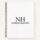 Modern business notebook featuring a simple and minimal black and white design with your monogram in a bold font along with your name on the front. The back has your contact info.