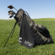This black golf towel has white text. You can change the text to show the correct monogram. A golf flag image is next to the initials.