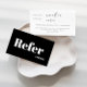 This stylish company "refer a friend" referral card includes bold typography and minimal black and white design.