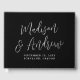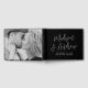 Add a personalised touch to your wedding ceremony with this Simple Black and White Script guest book. The design features your names displayed in an elegant white calligraphy script with your wedding date and location shown below on a black background. Add your custom text to the spine of the black and white guest book. The back of the guest book features your horizontal engagement photo.