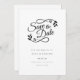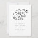 This simple black and white save the date card features a pretty script save the date with a leaf motif, set above your details in an elegant modern text.