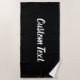 This black beach towel has a white script as its display text. You can edit it to show personalised text.