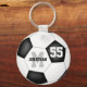 This simple, sporty soccer keychain for boys or girls features the realistic image of a traditional style soccer ball with black and white panels - customise with the player's name, monogram and jersey number - by katz_d_zynes