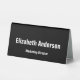 This black tabletop sign has white display text that you can edit. There are two lines of text on each side. The top line is for the recipient's name. The bottom line is for their professional title or a custom message such as an organisation name.