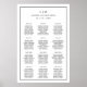 Simple wedding seating chart poster featuring a modern yet elegant design with your two letter monogram, names and date with the chart below, surrounded by a thin border. The template has three columns with twelve tables of eight guests as an example, but can be customised for your number of tables and guests. A chic and stylish black and white design that is great for a minimalist couple.