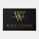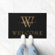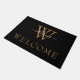Greet your guests in style with this simple personalised black doormat featuring your monogram in faux gold with your name above in modern hand lettered grey script. Below it reads "Welcome".