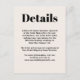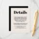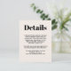 Provide your wedding guests with the details they will need surrounding your wedding. This trendy modern minimalist design has bold text and popular colour choices. Shown here in classic black with ecru coordinates with a matching set of wedding stationery and other products for your special day or event. You can edit the text template with hotel info, driving directions, special meet and greet gatherings and more. Simply edit the text template as desired. If you need to re-centre the text after customising it with your details, you can drag it into place to re-centre.