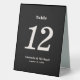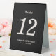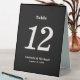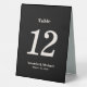 With simple minimalist styling and a slight retro vibe, this wedding table number is in the colour black with ecru beige lettering. The design repeats on both sides of the convenient free-standing table tent sign. Personalise with the bride and groom's name and wedding date. Create a separate table number sign for each table number you need and add to cart as you create each one. Once you have all your table numbers, complete the checkout process.