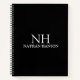 Modern business notebook featuring a simple and minimal black design with your monogram in a bold font along with your name on the front. The back has your contact info.