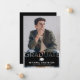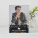 Trendy black graduation announcement card featuring a picture of the graduate, a motarboard, and a modern text template that is easy to personalise.