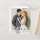 Thank your wedding guests in style with this elegant custom photo thank you postcard. This typography design template features your picture on the front with an overlay and the words "Thank You" in black script and your names and wedding date to personalise. The back of the postcard has a custom message and signature on a white background. Designed by artist Susan Coffey.
