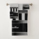 A cute bath towel set featuring a simple geometric pattern consisting of black, grey and silver vertical and horizontal stripes. Monogrammed with an initial and script name for your personalisation. Customise it with your details.