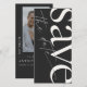 These 4" x 8" save the date cards feature a minimalist design in eggshell white and grey letters on a black background with placeholders on the back for the engaged couple names, wedding date, and venue information and your favourite photo!